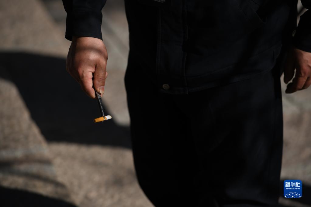 4月21日,秦志平在黃山風景區進行路段巡查時將地面的煙頭放進指定位置。