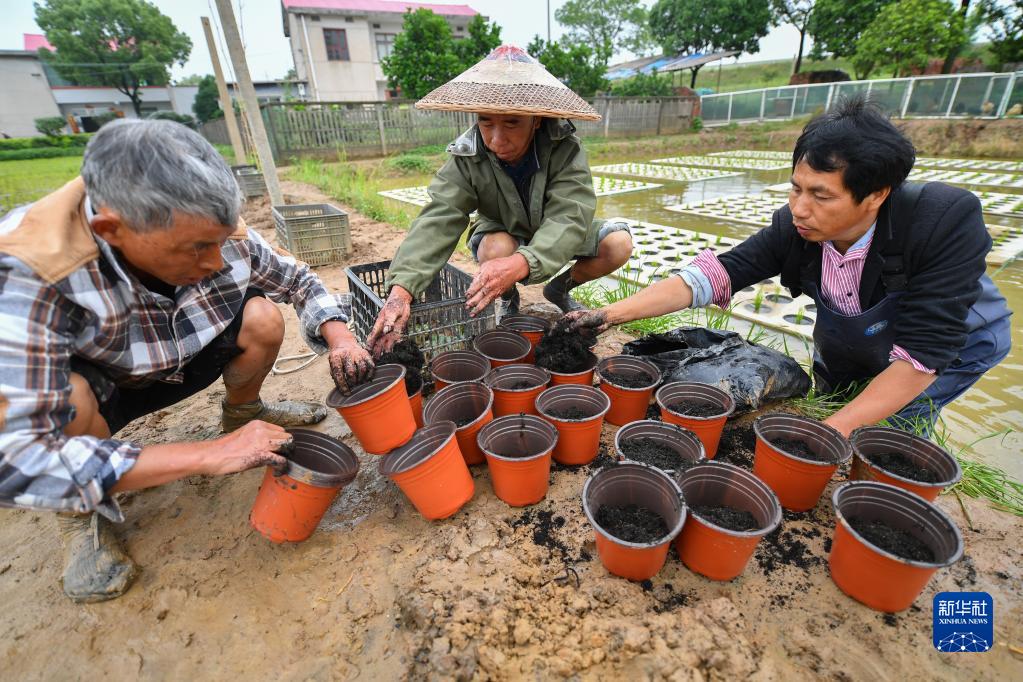 5月11日,在長沙市望城區高塘嶺街道湘江村,農民將營養土放入盆中。