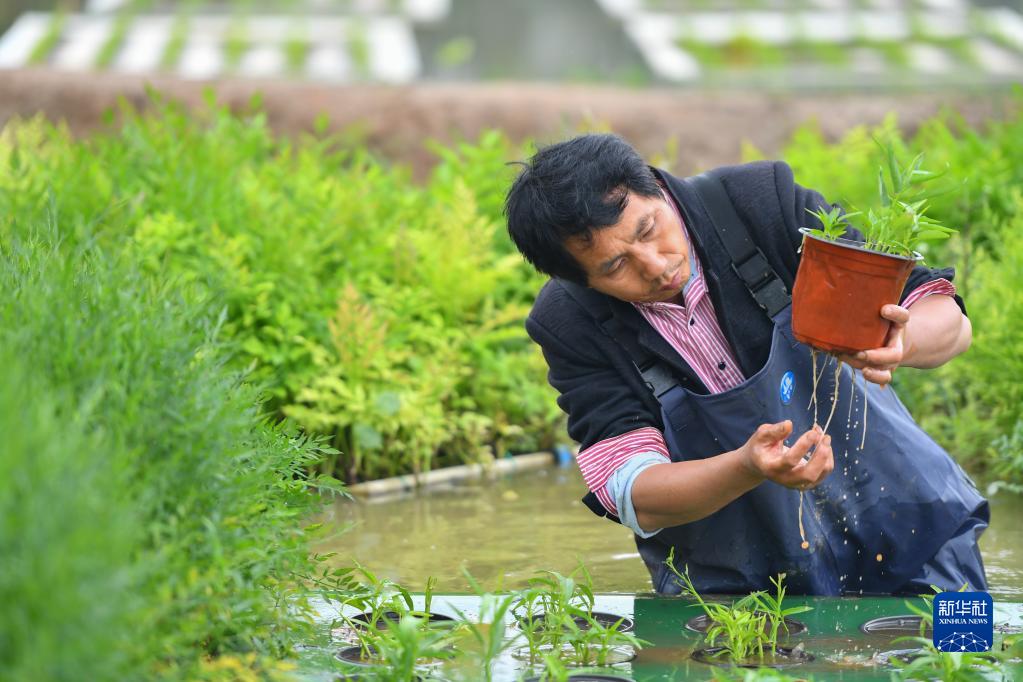 5月11日,在長沙市望城區高塘嶺街道湘江村,農民檢查水上種植的空心菜的根部。