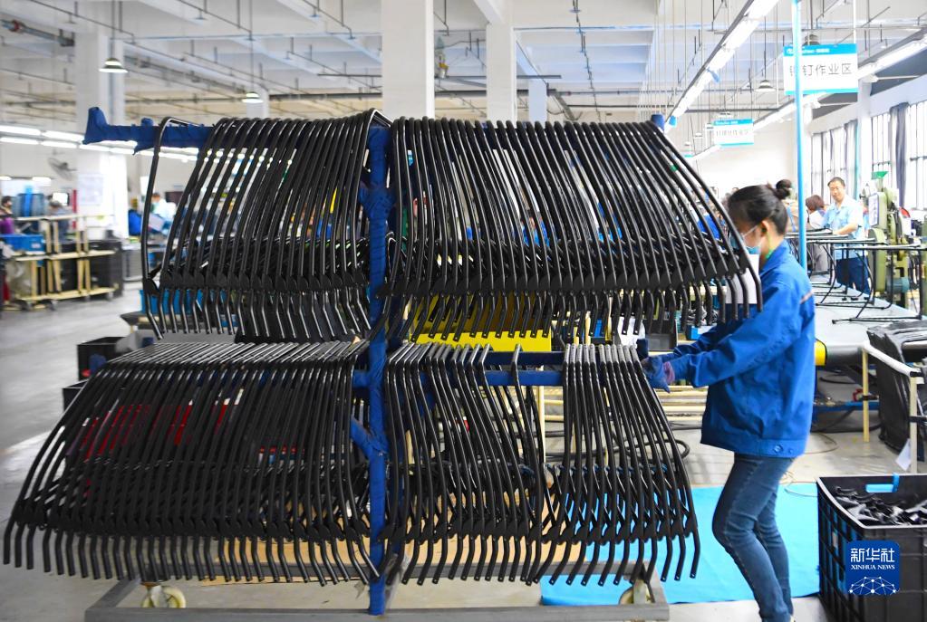 5月10日,工作人員在河南省駐馬店市平輿縣一家戶外用品企業安裝車間忙碌。