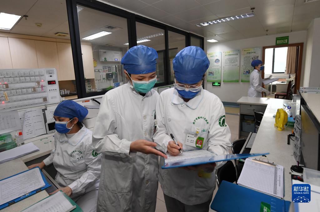 5月10日,在廣西南寧市第四人民醫院,黃小賢(前右)在和同事核對有關病人信息。