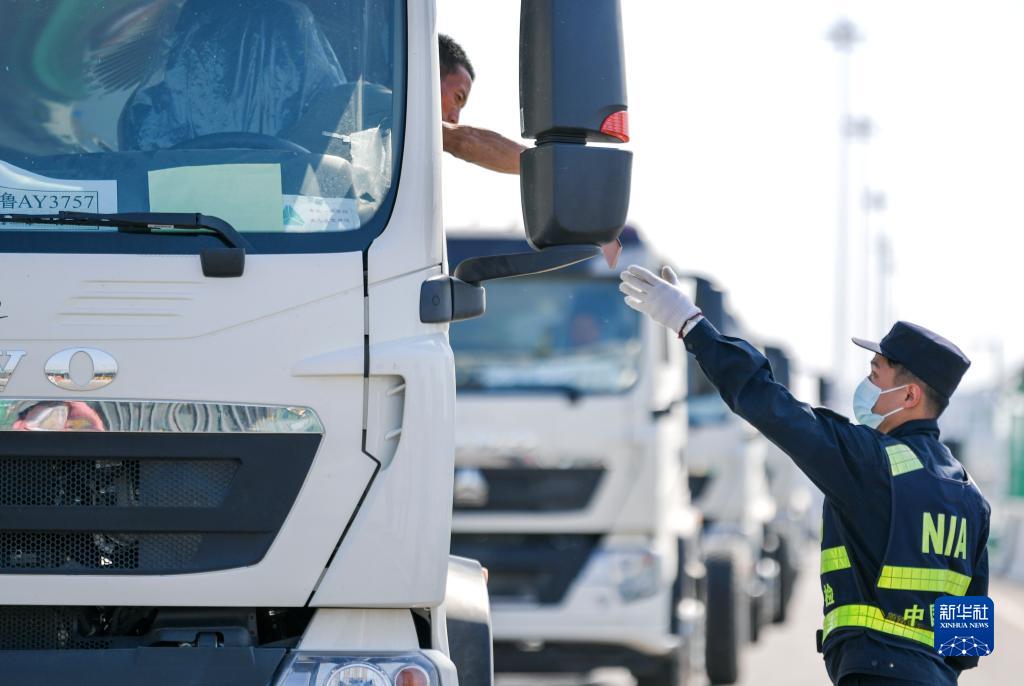 5月10日,在新疆霍爾果斯公路口岸,霍爾果斯出入境邊防檢查站執勤民警對出境商品車進行查驗。
