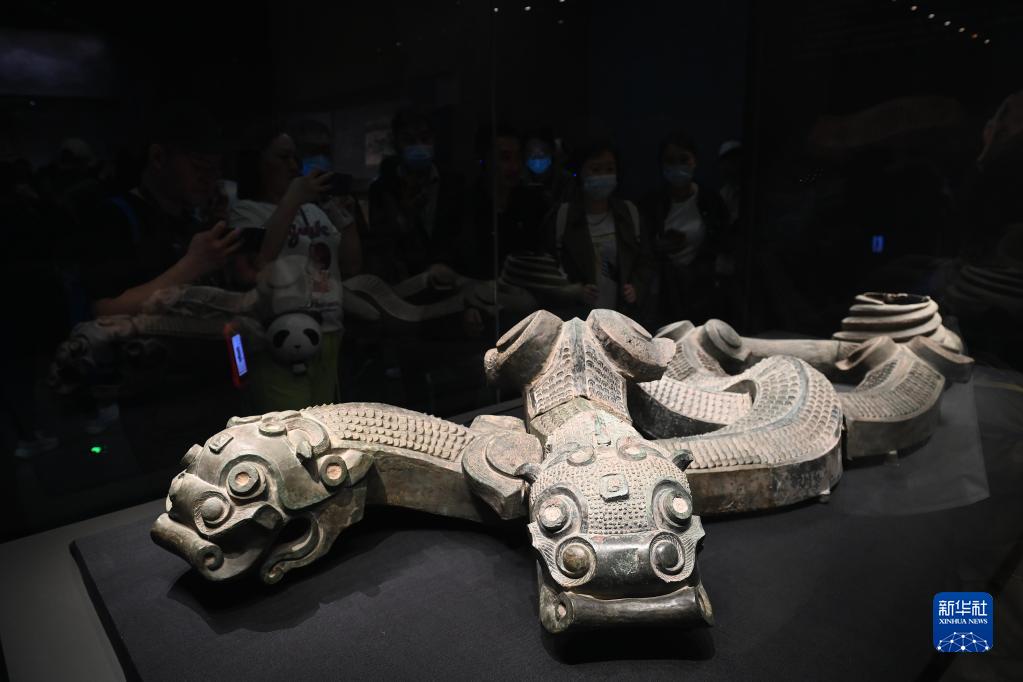 5月11日,游客在陜西歷史博物館參觀館藏戰國文物青銅龍。