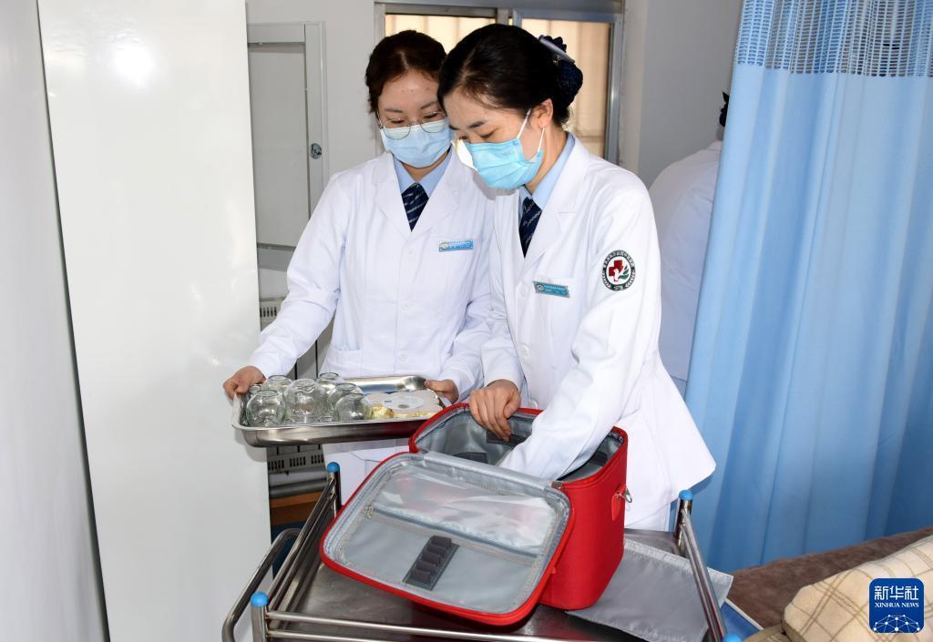 5月10日,青島西海岸新區中醫醫院護士徐海燕(右)和同事曹源在根據接單項目準備上門服務所需器械。