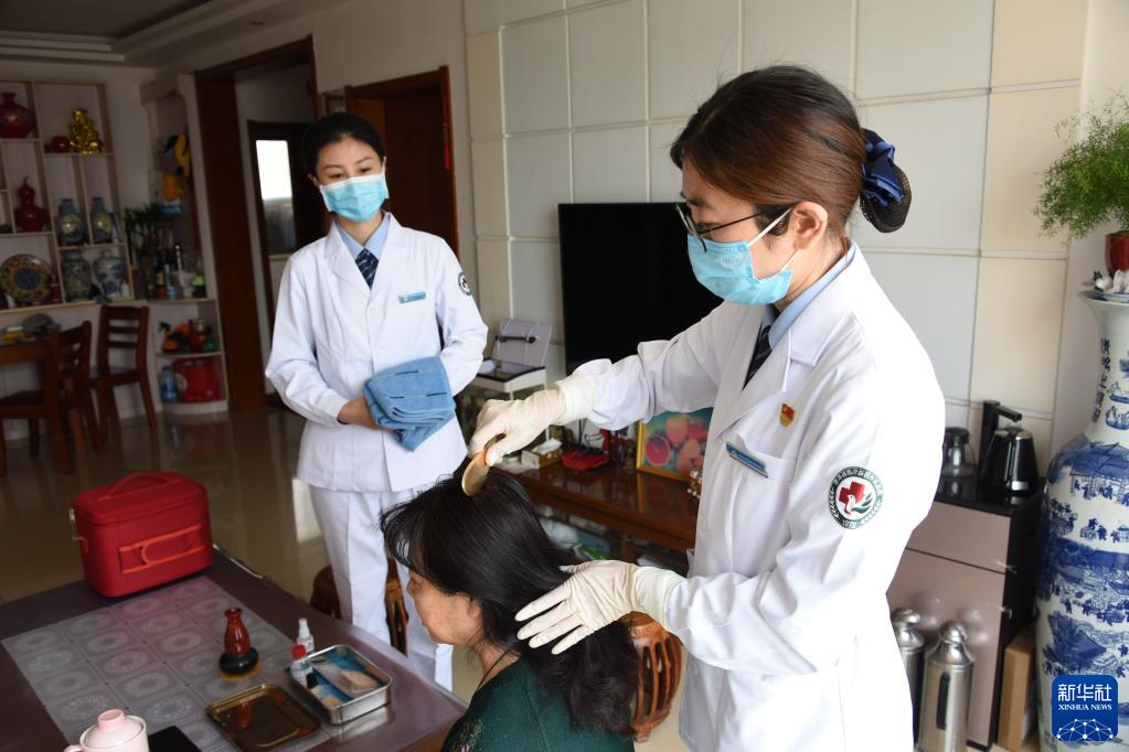 5月10日,青島西海岸新區中醫醫院網約護士張奕(右)在患者家中進行頭部銅砭刮痧治療。