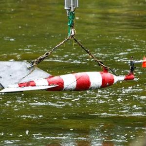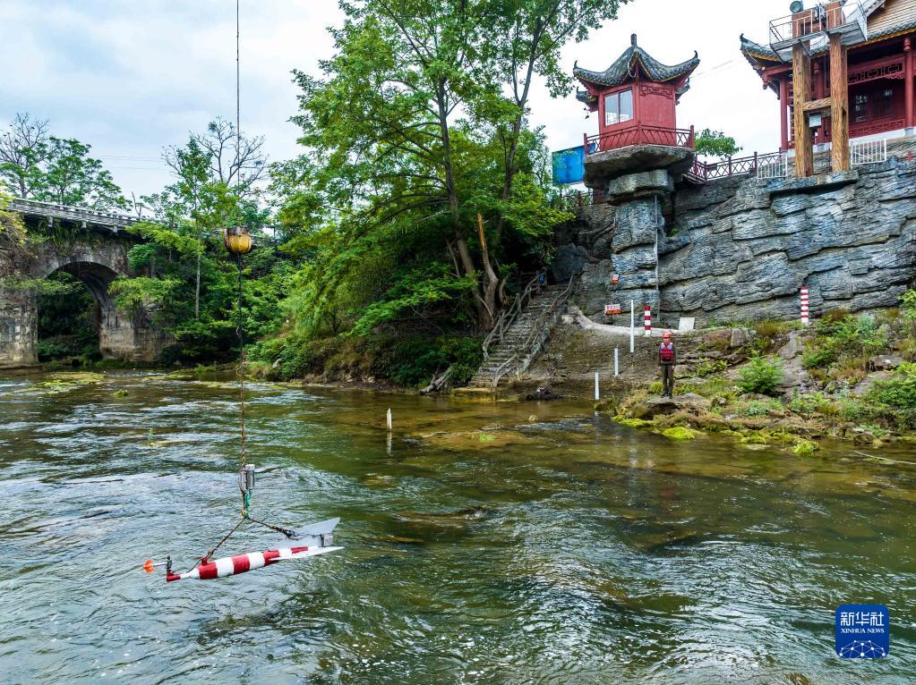 5月10日,在貴州省黃果樹水文監測站,水文工作人員在觀察纜道測流鉛魚入水情況。