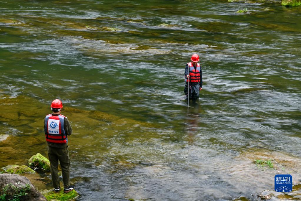 5月10日,水文工作人員在貴州省黃果樹水文監測站開展低水流量涉水施測工作。
