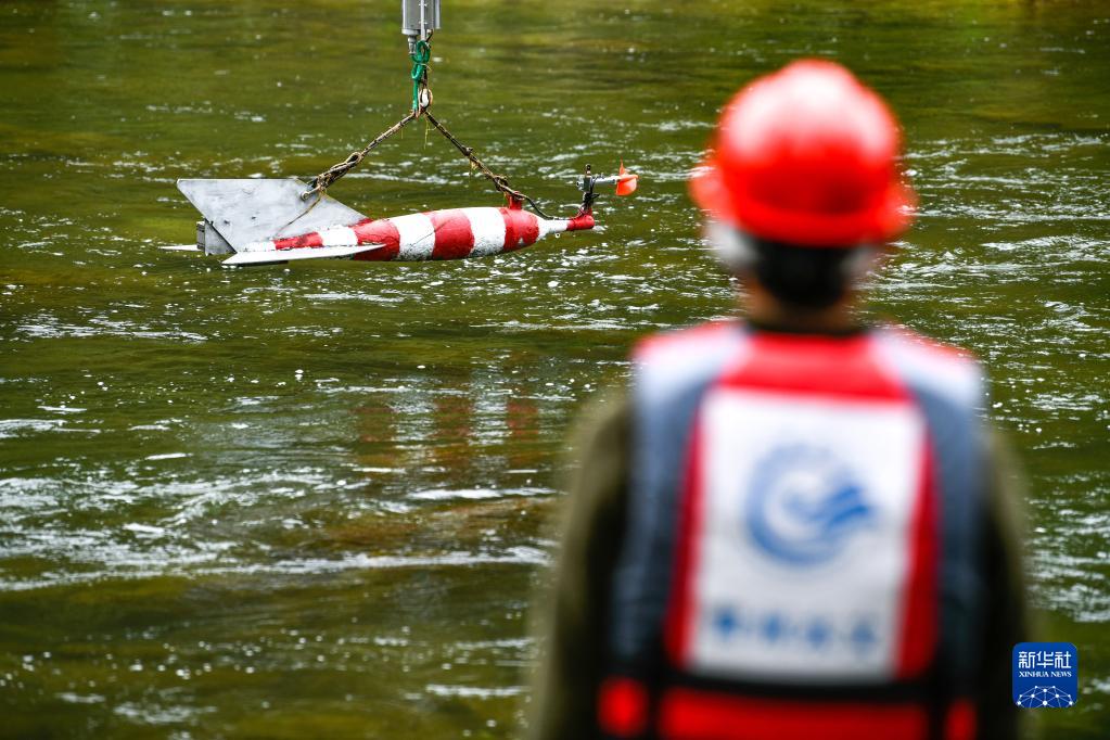 5月10日,在貴州省黃果樹水文監測站,水文工作人員在觀察纜道測流鉛魚入水情況。