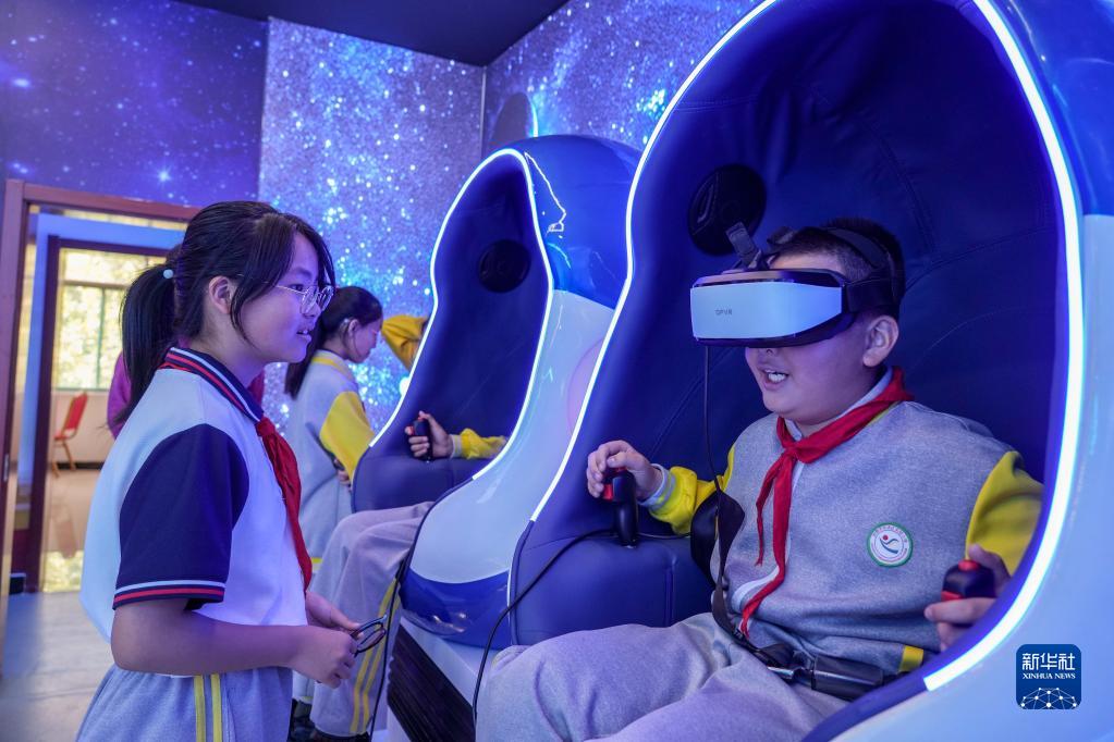5月11日,小學生在馬店村科普體驗中心內體驗VR科普展品。
