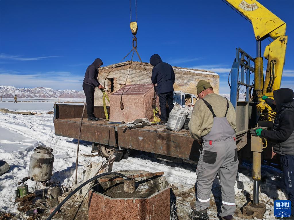 在吉爾吉斯斯坦納倫州,工作人員準備在“中吉友誼井”(前)旁安裝紀念石碑(2022年11月26日攝)。