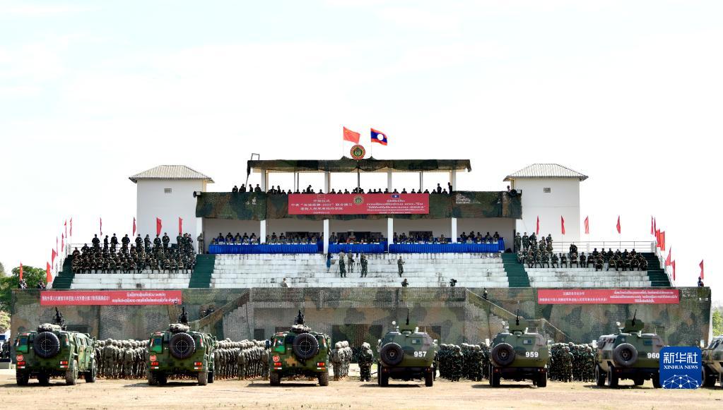 這是5月11日在老撾人民軍庫瑪丹學院訓練場拍攝的中老“友誼盾牌-2023”聯演開始儀式。新華社發(陽吉成攝)