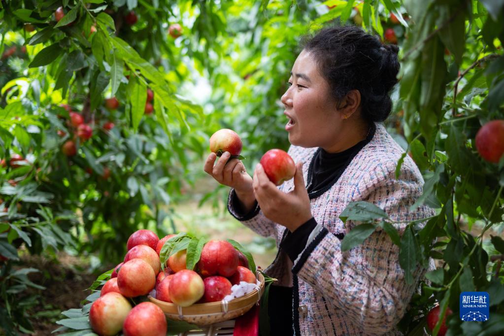 5月10日,在陜西渭南市大荔縣埝橋鎮北黃村油桃大棚,馬寧在網上做直播帶貨售賣油桃。