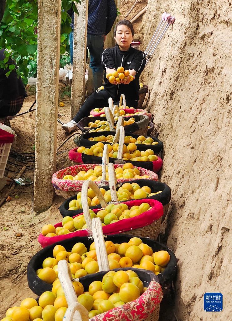 馬寧在陜西省渭南市大荔縣埝橋鎮孟家村溫室大棚直播賣大黃杏(2021年3月31日攝)。