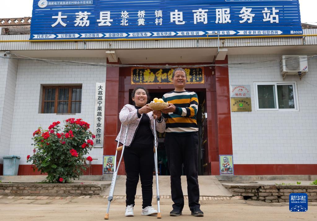 5月10日,在陜西渭南市大荔縣埝橋鎮北黃村的家中,馬寧和丈夫侯家喜展示黃杏。馬寧的家同時也是她注冊的“大荔荔寧果蔬專業合作社”。