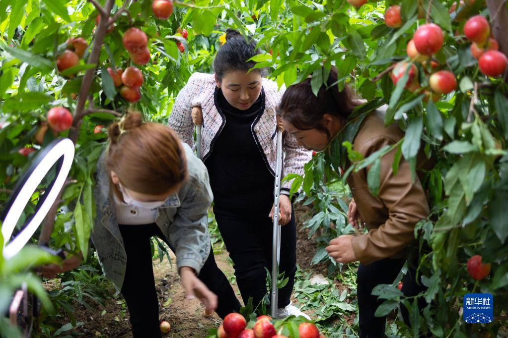 5月10日,在陜西渭南市大荔縣埝橋鎮北黃村油桃大棚,馬寧(中)在網上做直播帶貨后與同事收拾油桃。