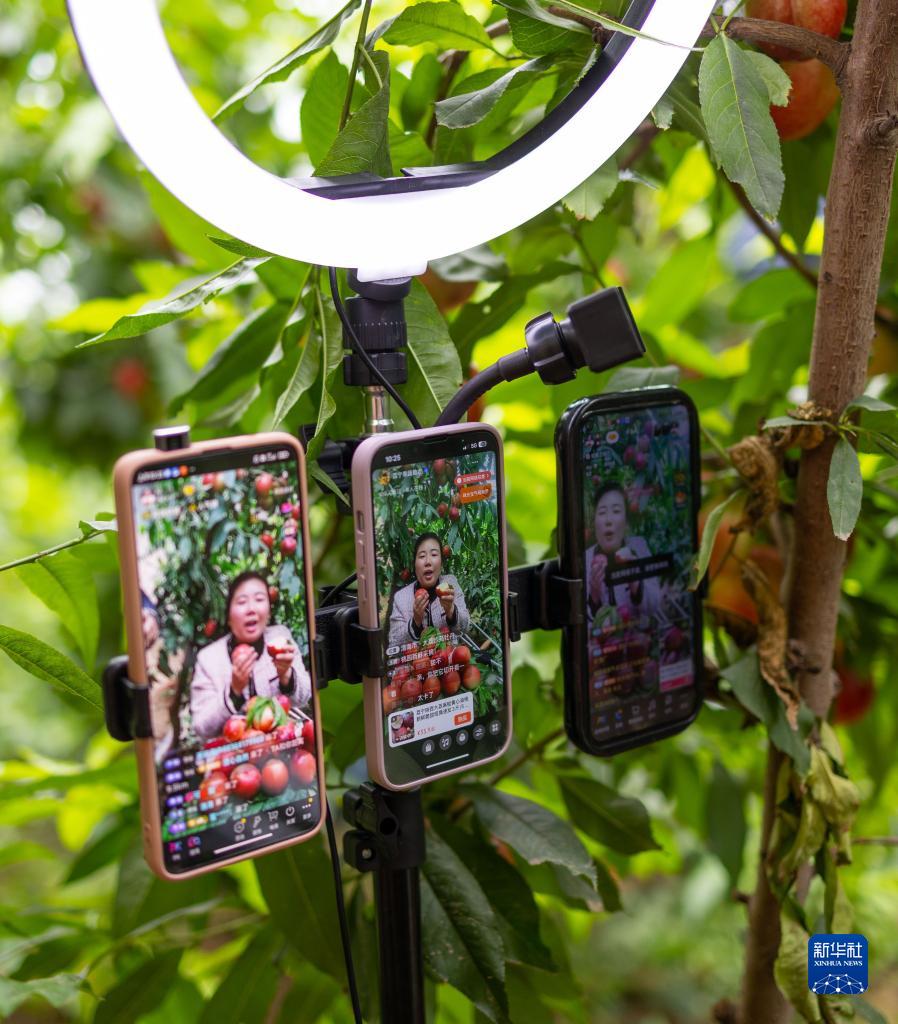 5月10日,在陜西渭南市大荔縣埝橋鎮北黃村油桃大棚,馬寧在三個平臺一起做直播帶貨售賣油桃。