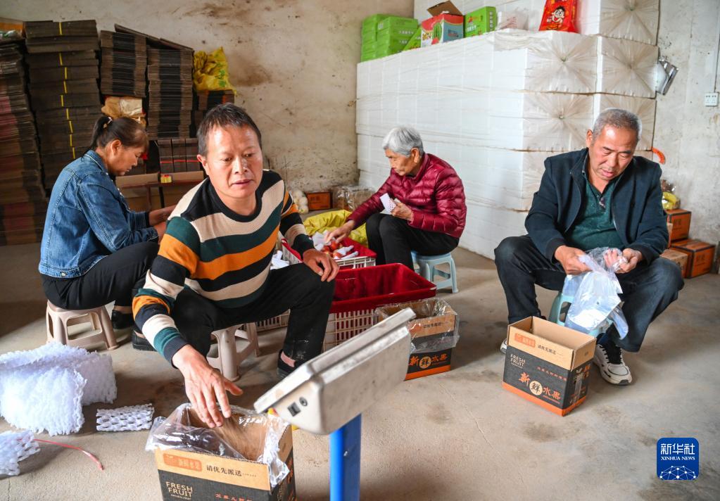 5月10日,馬寧的丈夫侯家喜(前)將油桃裝箱稱重。