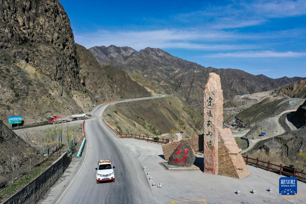 烏蘭薩德克養護站的工人駕車下山,途經獨庫公路旁的“守護天山路”文化景觀雕塑(5月11日攝,無人機照片)。