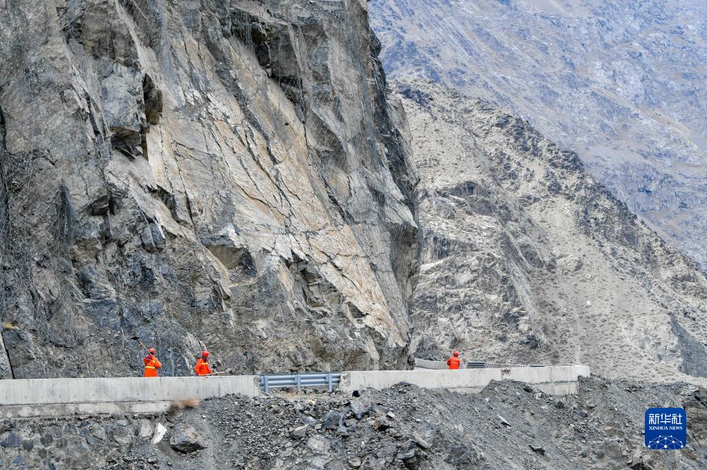 烏蘭薩德克養護站的工人在獨庫公路上清理碎落的山石(5月8日攝)。