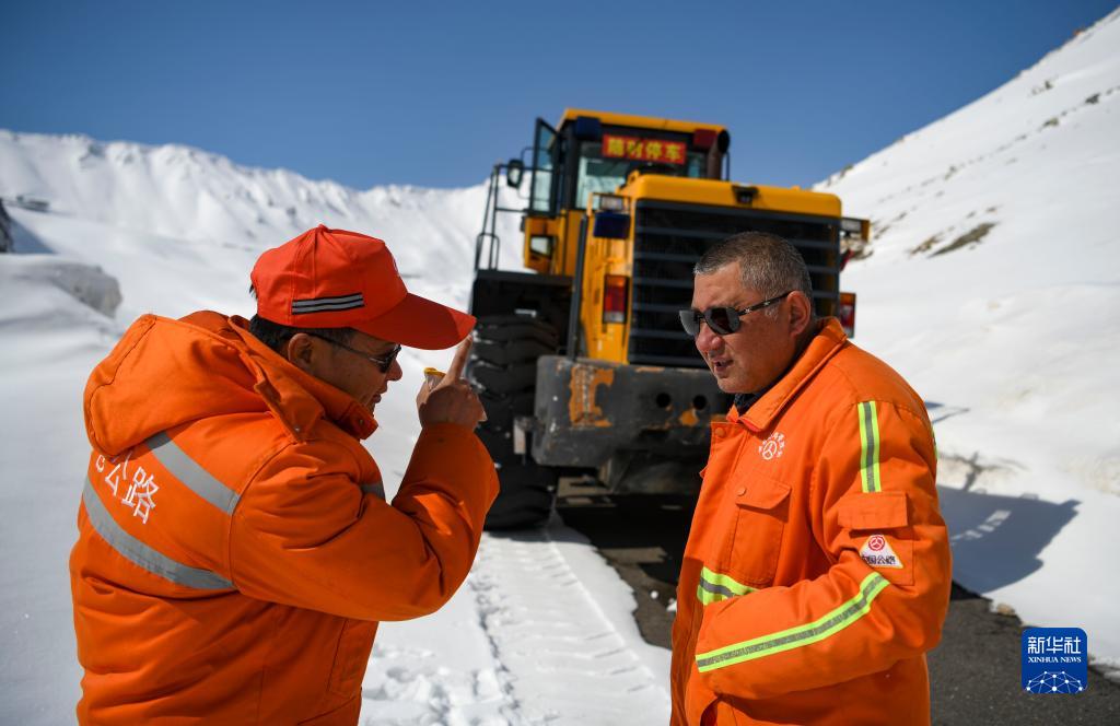 烏蘭薩德克養護站工人宋雪嶺(左)和工友烏斯曼·巴克商量當天的除雪計劃(5月9日攝)。