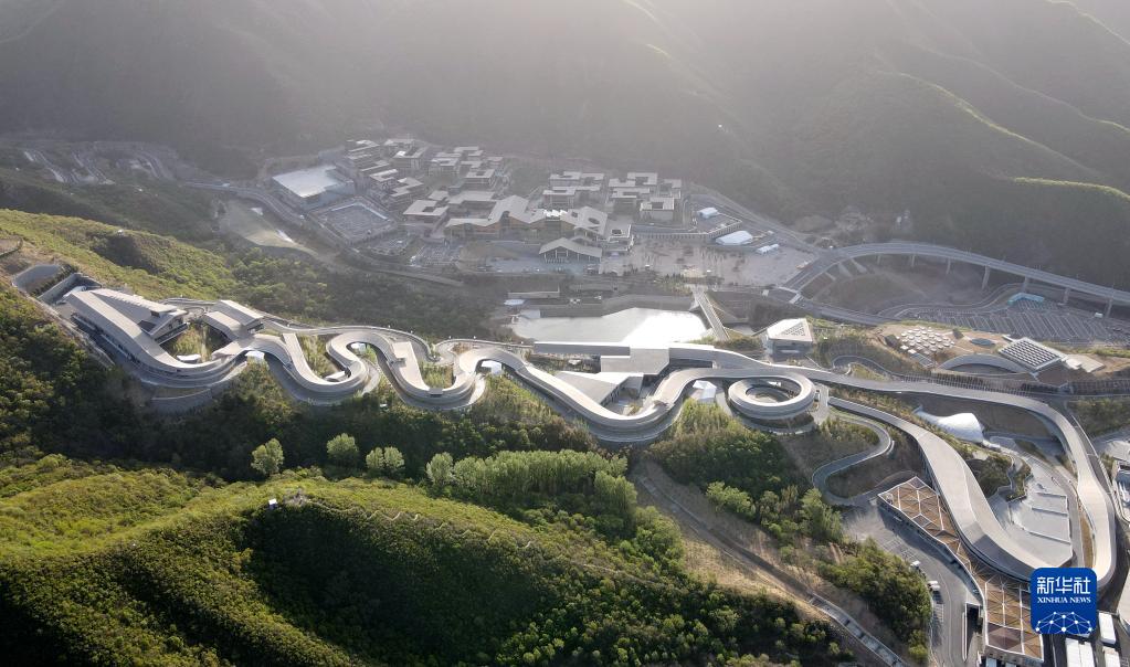這是在北京市延慶區拍攝的國家雪車雪橇中心和冬奧村(2022年4月26日攝,無人機照片)。