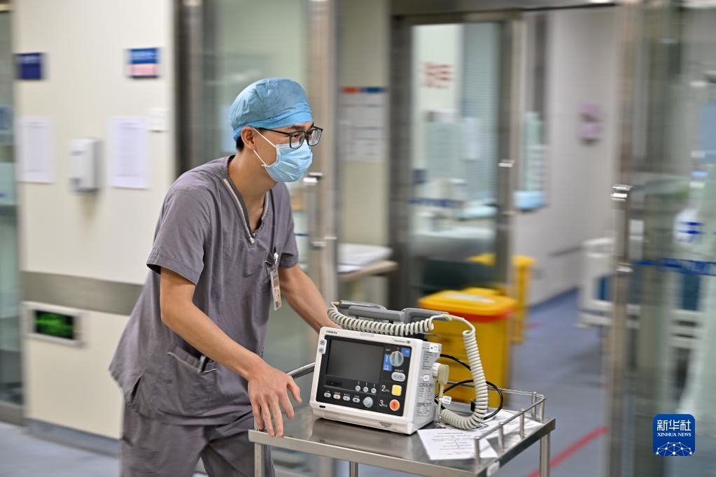 5月11日4時許,北京協和醫院內科重癥監護病房(MICU)護士郭宏偉運送除顫儀。