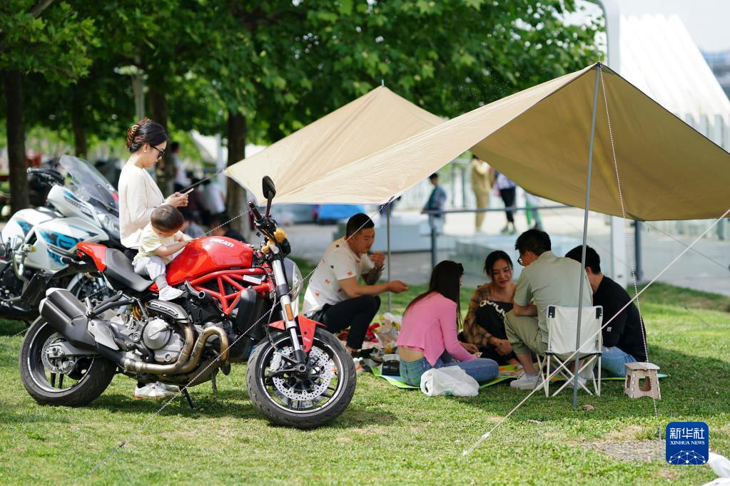 市民在西安灞河岸邊的公園內露營休閑(2022年5月15日攝)。