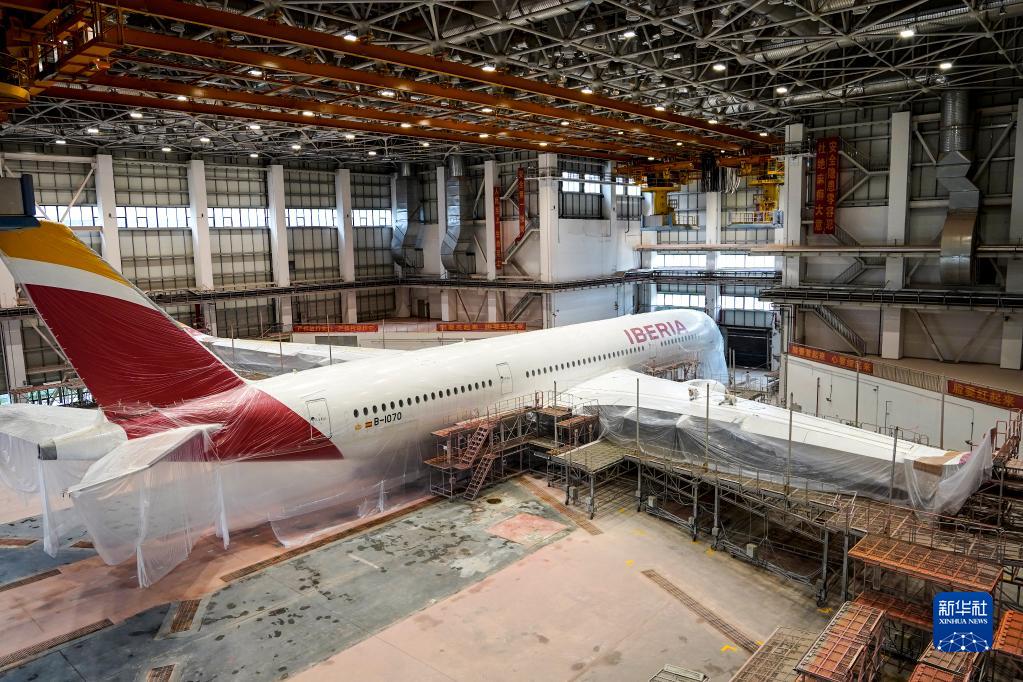 5月11日,噴涂作業員對空客A350-900寬體客機進行打磨除漆。