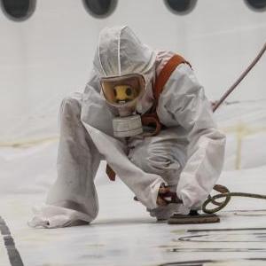 5月11日,在海南自貿港一站式飛機維修產業基地內,噴涂作業員對一架空客A350-900寬體客機進行噴漆打磨工作。完成整機噴涂后,這架飛機將從??诿捞m國際機場飛往西班牙首都馬德里完成交付。據悉,這是海南自貿港一站式飛機維修產業基地投產以來承接的首單空客A350機型飛機整機噴涂業務。