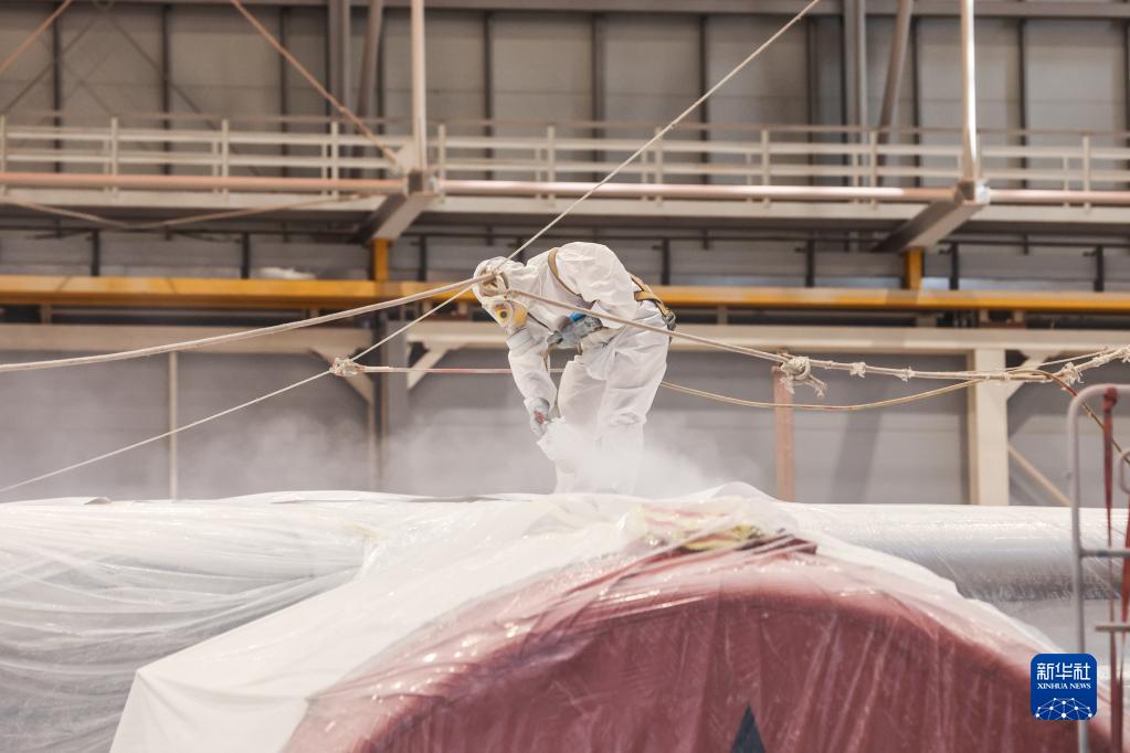 5月11日,在海南自貿港一站式飛機維修產業基地內,噴涂作業員對一架空客A350-900寬體客機進行噴漆打磨工作。完成整機噴涂后,這架飛機將從??诿捞m國際機場飛往西班牙首都馬德里完成交付。據悉,這是海南自貿港一站式飛機維修產業基地投產以來承接的首單空客A350機型飛機整機噴涂業務。
