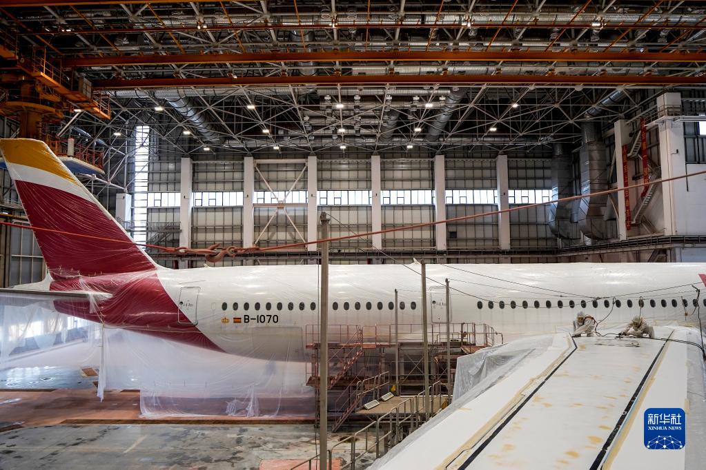 5月11日,噴涂作業員對空客A350-900寬體客機進行打磨除漆。
