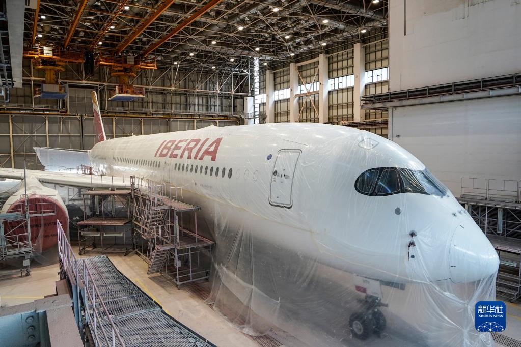 這是5月11日在海南自貿港一站式飛機維修產業基地內拍攝的空客A350-900寬體客機。