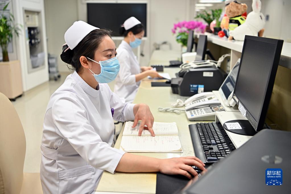 5月11日6時許,北京協和醫院基本外科四病房護士李婷(前)在書寫護理記錄并錄入電腦;李美宣在檢查護理記錄并蓋簽名章。