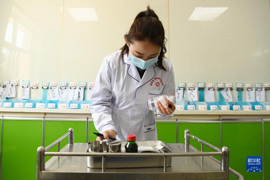 在武都區桔柑鎮衛生院住院部護士站,李瑞給患者配藥(5月11日攝)。