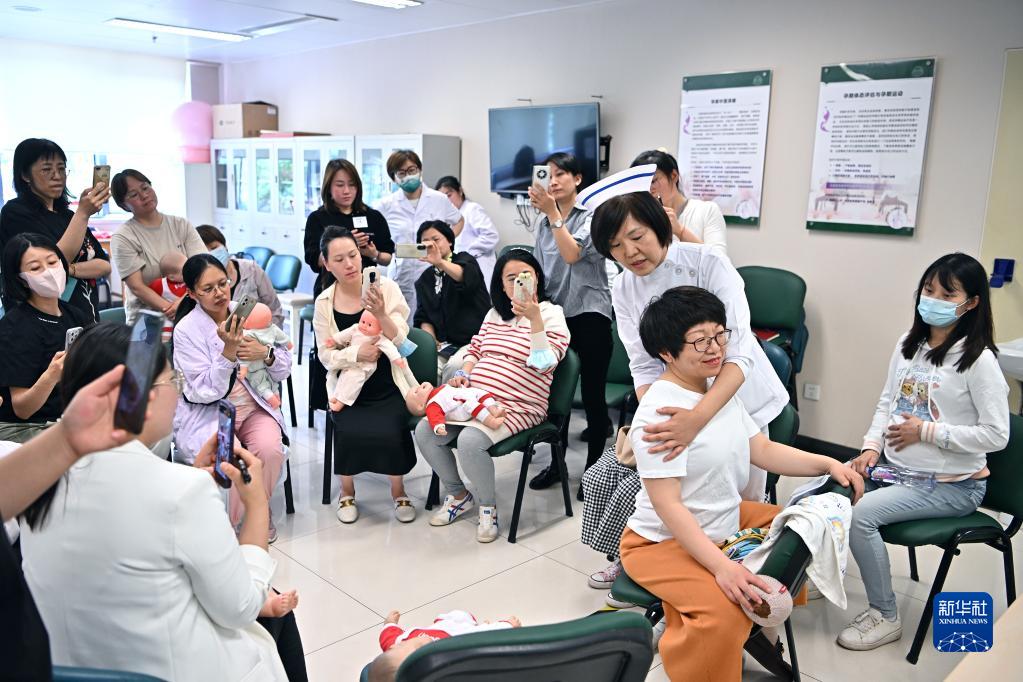 5月9日11時許,北京協和醫院產科門診護士長李蕊(著護士裝者)在孕婦學?;顒又信c來院交流的產科醫護人員及孕婦交流護理技巧。