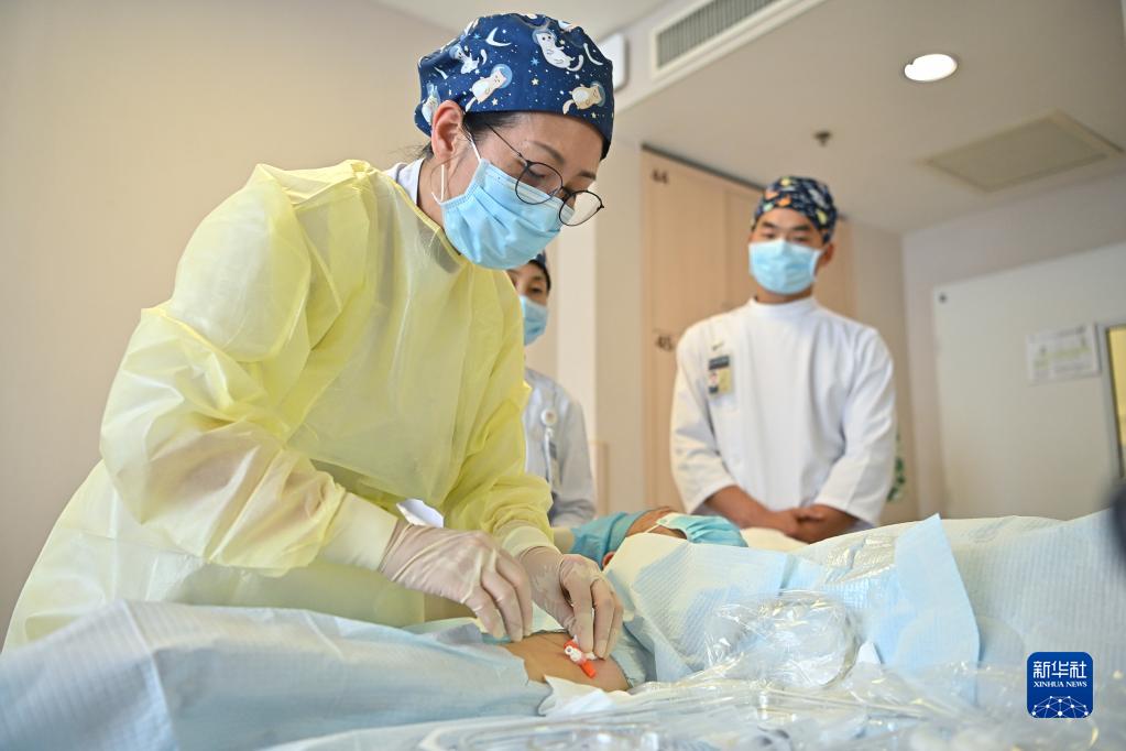 5月9日14時許,北京協和醫院臨床營養科護士長孫文彥(前)在給患者置入外周中心靜脈導管(PICC)。外周中心靜脈導管是危重癥和慢病患者的“生命線”,1997年北京協和醫院引進PICC置管術。