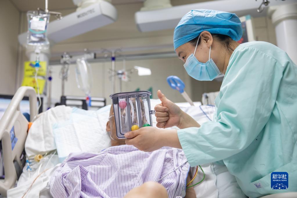 5月10日14時許,北京協和醫院重癥醫學科(ICU)護士劉艷妍為病人進行呼吸功能訓練。