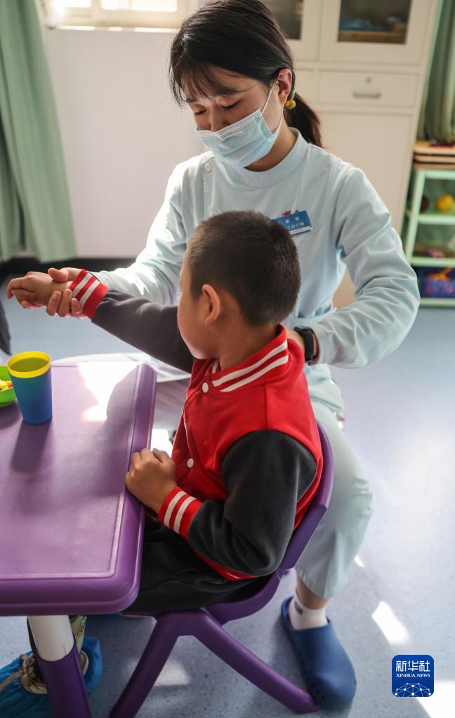 5月11日,康復治療師在渭南腦病康復醫院幫助患兒進行上肢被動訓練。