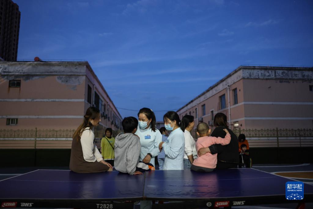 5月8日晚,評估師在渭南腦病康復醫院的天臺與患兒聊天。