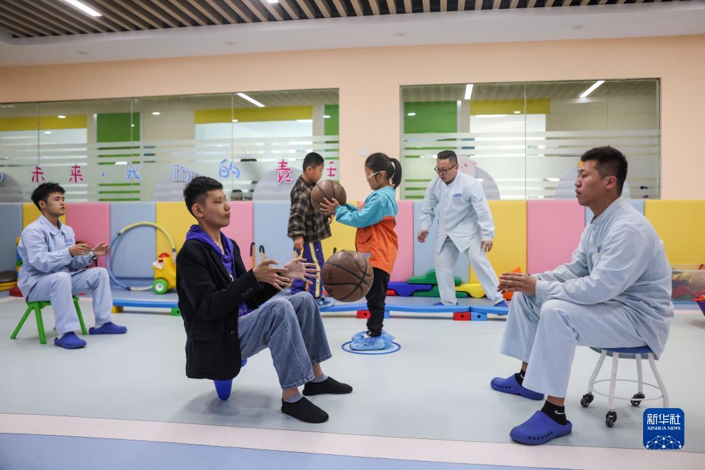 5月11日,康復治療師在渭南腦病康復醫院幫助患兒進行感覺統合訓練。