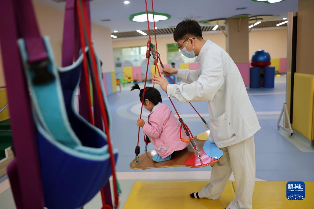 5月11日,康復治療師在渭南腦病康復醫院幫助患兒進行蹲位平衡訓練。