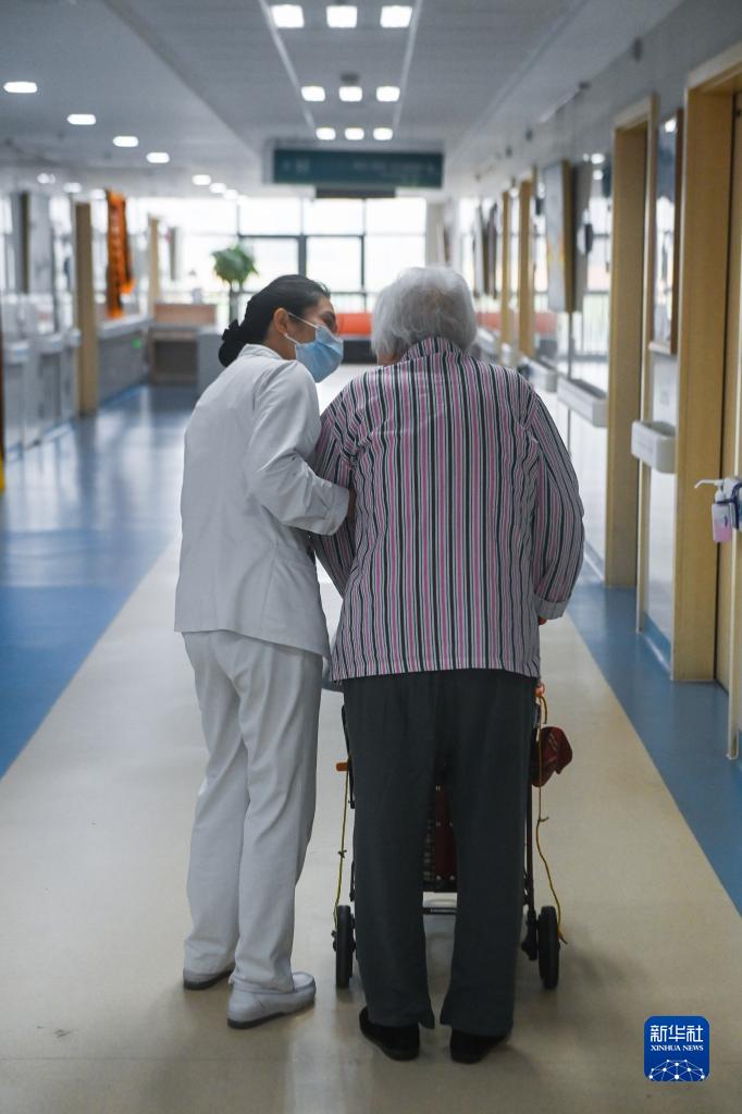 5月11日,浙江醫院醫療照護病房的護士在病區走廊內陪患者散步。