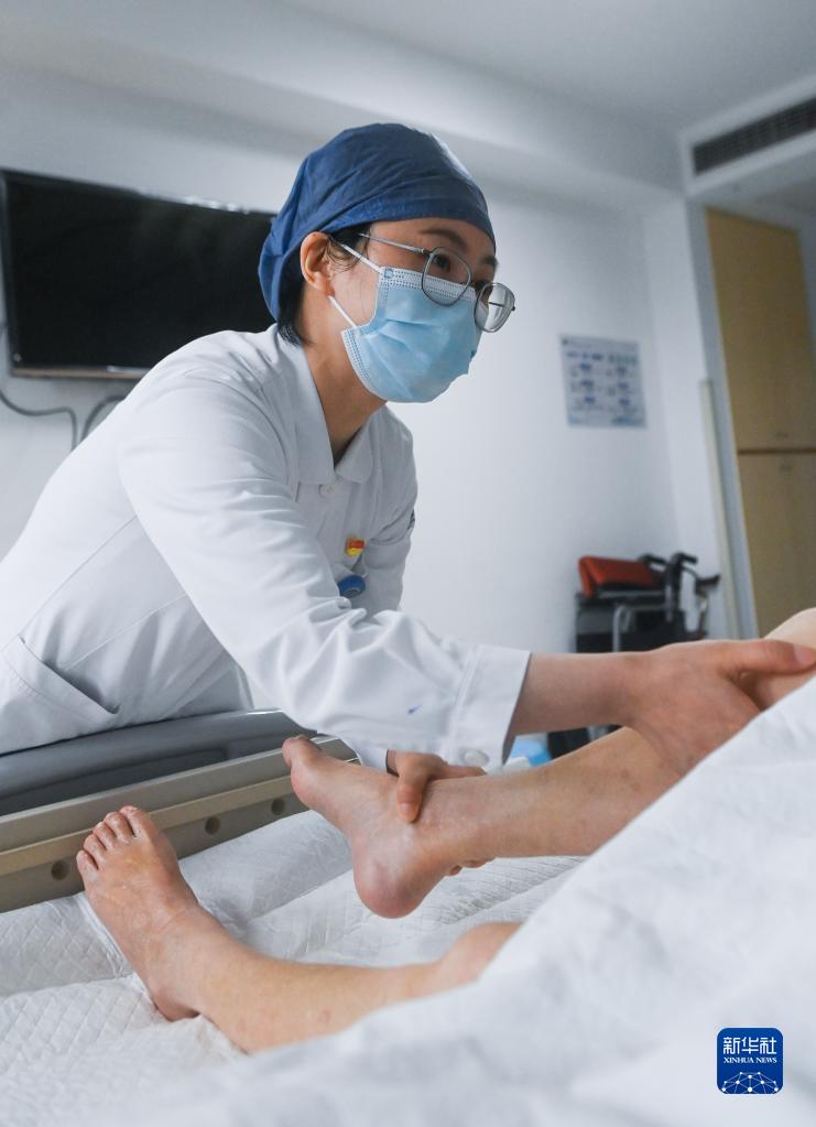5月11日,浙江醫院醫療照護病房的護士在病房內為臥床患者進行日常手足護理。