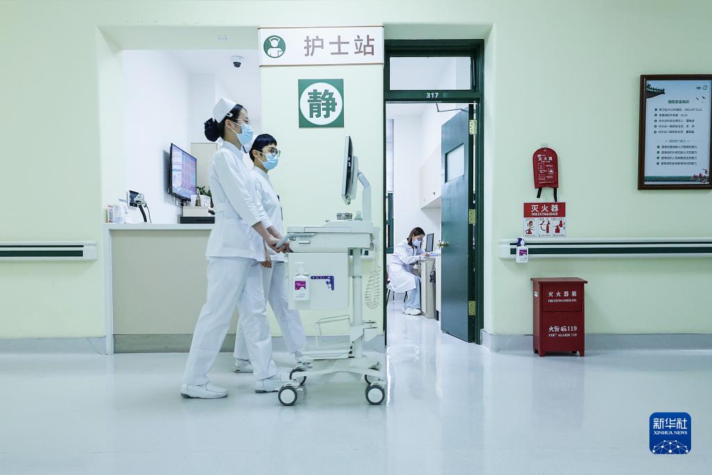 5月9日18時許,北京協和醫院內分泌科護士李蕊(右)與護理學院學生推著移動護理車走過病房。