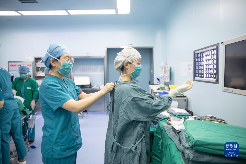 5月9日20時許,北京協和醫院手術室護士張圣潔(左)和喬亞如進行急診手術開臺準備工作。
