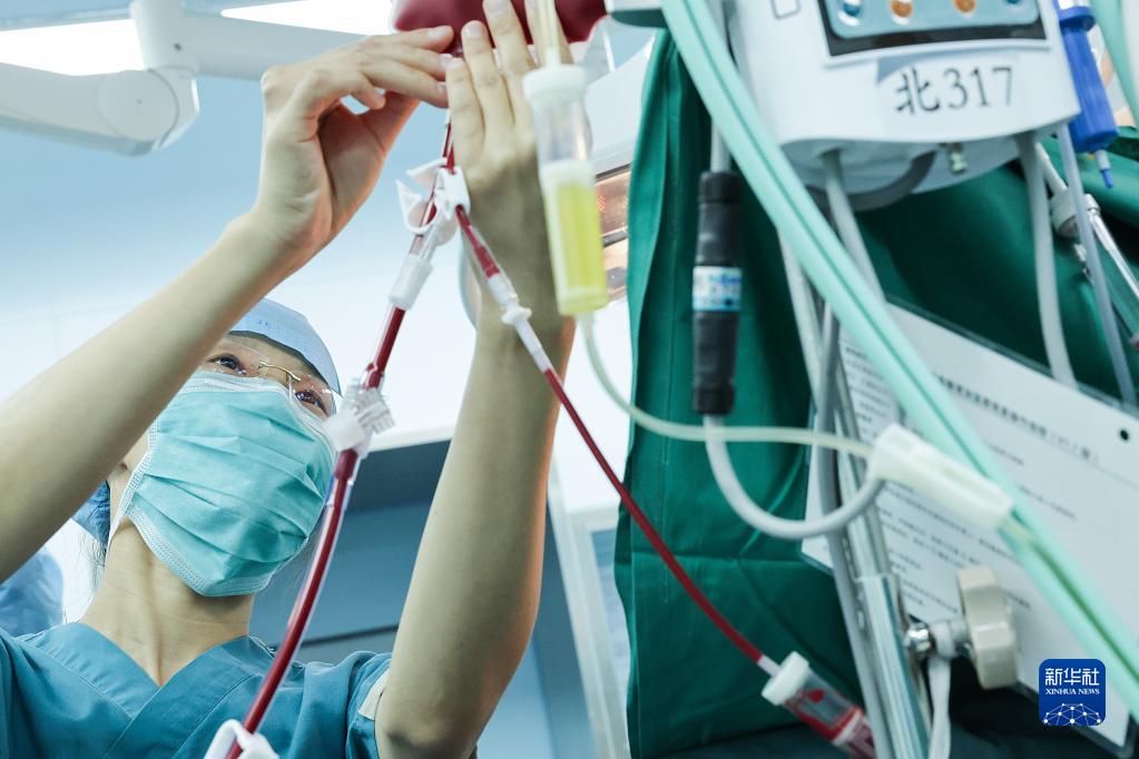 5月9日20時許,北京協和醫院手術室護士任珊珊在手術臺旁進行輸血操作。