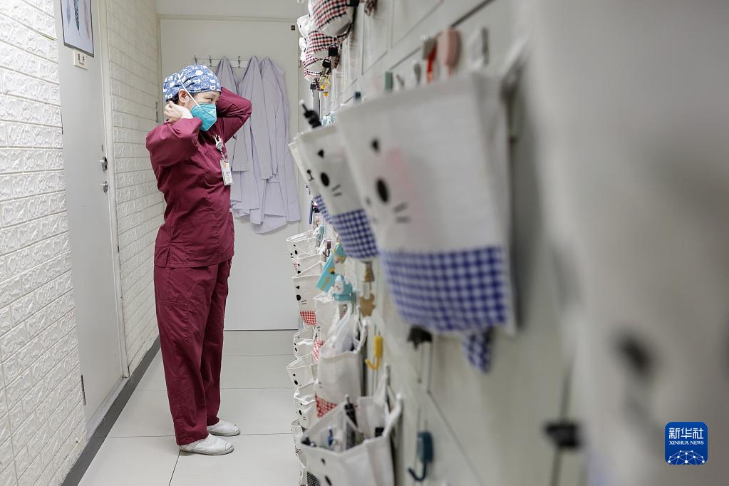 5月9日22時許,北京協和醫院急診搶救室護士朱槿在休息區整理帽子,做交班前準備。