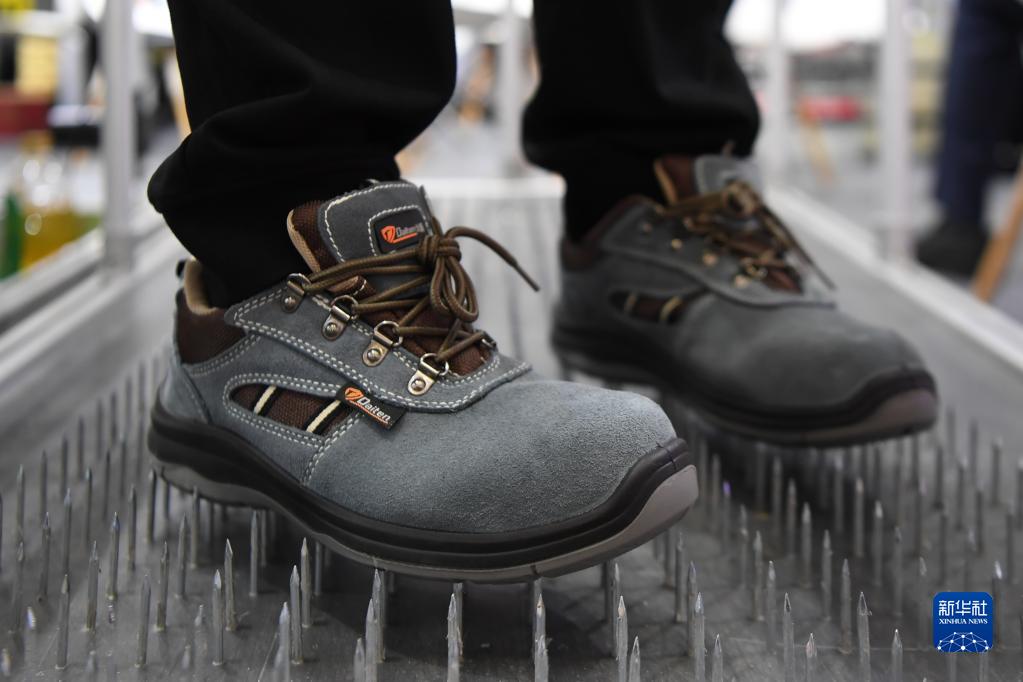 5月12日,參展商在長沙國際工程機械展覽會現場展示一雙防刺穿勞保鞋。