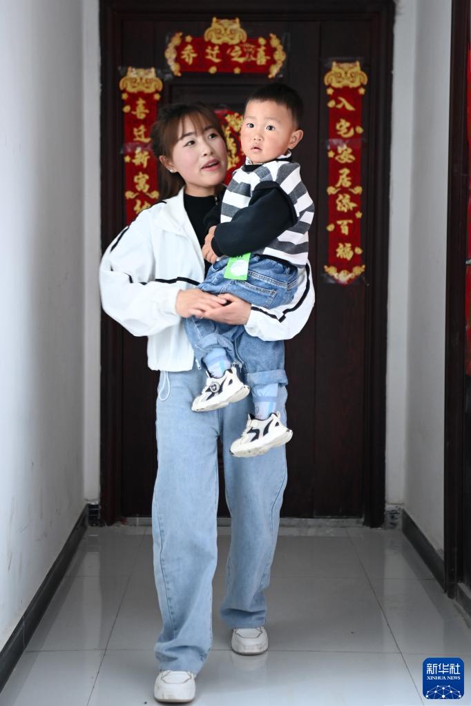5月10日,在甘肅省隴南市武都區兩水鎮安置點,搬遷群眾張平花抱著孩子走出新家。