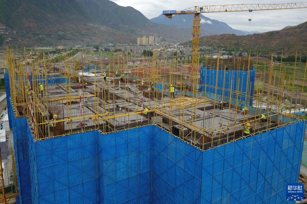 在甘肅省隴南市武都區生態及地質災害避險搬遷漢王片區集中安置點建設現場,工人在施工中(5月10日攝,無人機照片)。